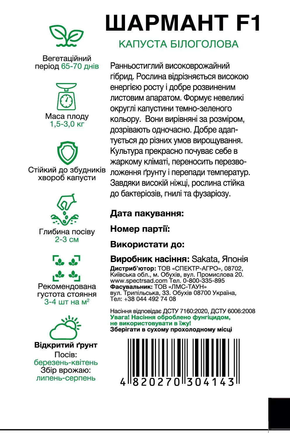 НАСІННЯ КАПУСТИ БІЛОГОЛОВОЇ ШАРМАНТ F1, УПАКОВКА 20 ШТ