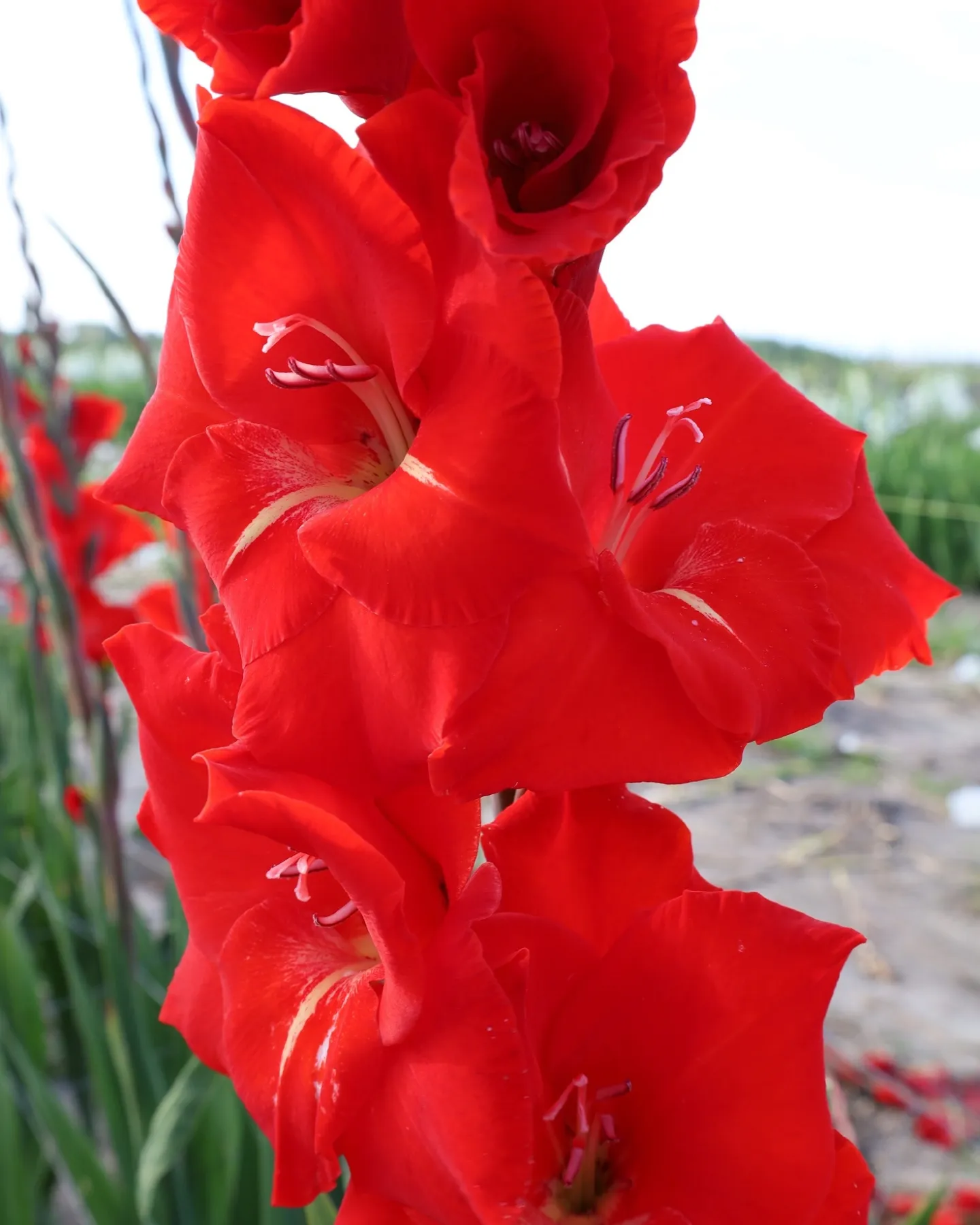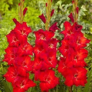 Гладіолус Chinon — виразний великоквітковий сорт із насичено-червоними, оксамитовими квітами та легкими кремово-жовтими вкрапленнями. Високі міцні стебла формують ефектні колосоподібні суцвіття, які добре виглядають у саду, на клумбі та у зрізі. Сорт підходить для створення яскравих вертикальних акцентів у квітнику, групових посадок і святкових букетів.