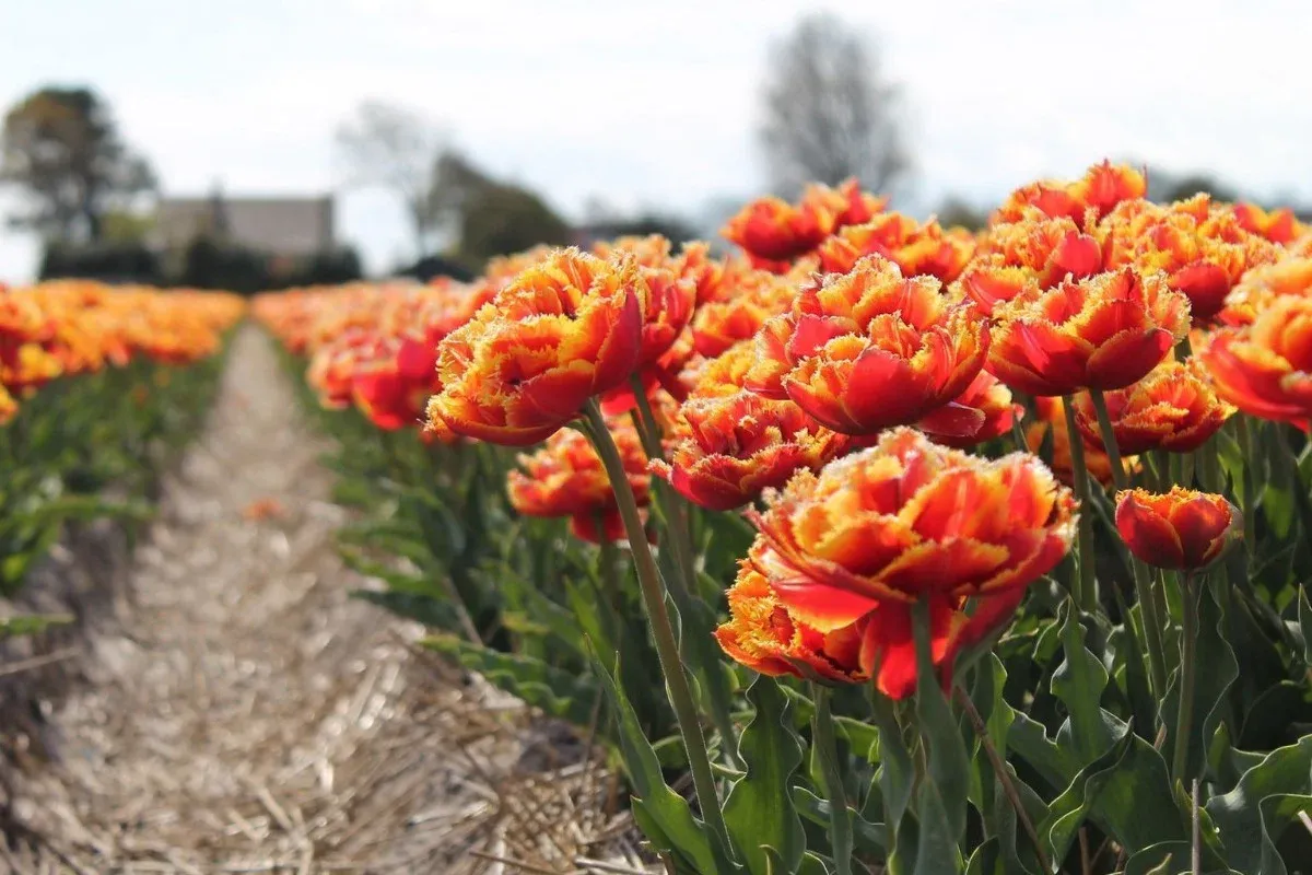 Тюльпан Golden Dust — один із найефектніших махрових сортів із бахромчастими пелюстками. Його квіти мають неповторне поєднання кольорів: насичено-червоні та помаранчеві пелюстки обрамлені золотистою бахромою, що створює враження сяйва на сонці.