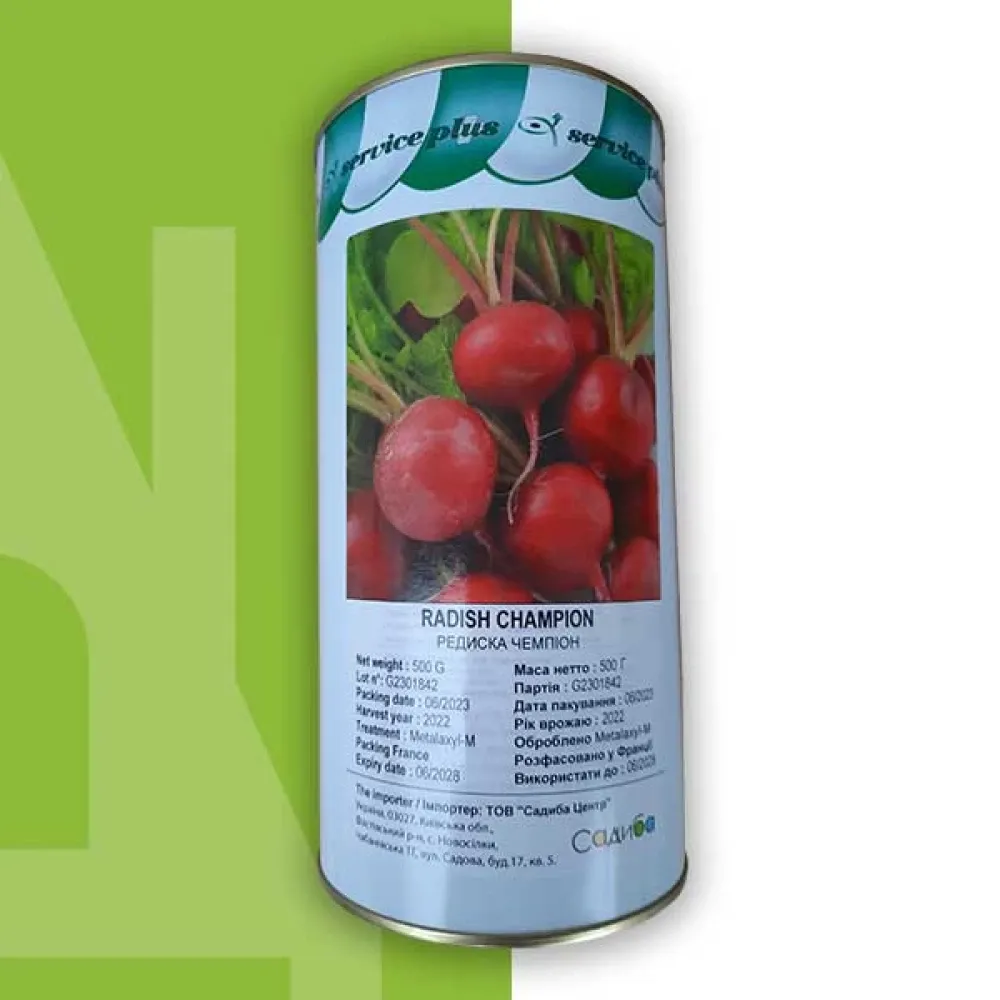 Редиска Чемпіон - пізньостиглий (30-40 днів) сорт для вирощування у весняно-літний період у відкритому й закритому ґрунті. Гичка маленька, компактна. Коренеплоди округлі, малиново-червoного кольору, в діаметрі 3,5-4,0 см, вагою 20-25 г. М’якуш білий, ніжний, хрусткий і соковитий, солодкуватий на смак із приємною гостринкою. Сорт має подовжений період формування врожаю. Плоди виповнені, не мають порожнин і довго не дрябліють, привабливо й апетитно виглядають у пучечках. Урожайність 1,1-1,4 кг/м2. Сорт популярний серед городників, оскільки невибагливий в догляді, не вражається хворобами й не стрілкується, дуже смачний, гарантовано забезпечує якісний врожай.