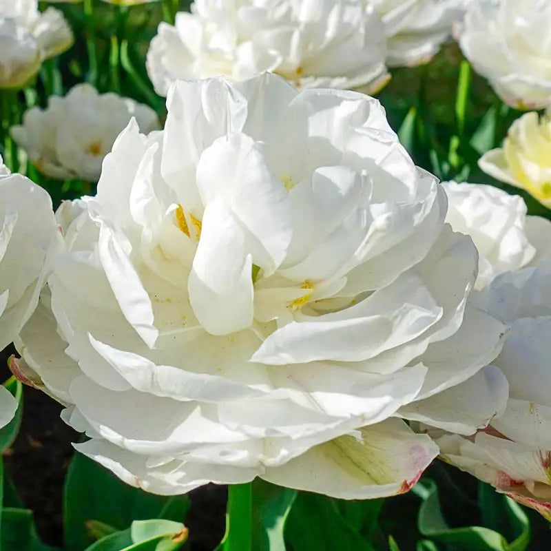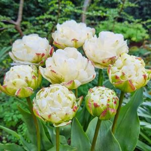 Tulipa ‘Cotton Candy’ — ефектний подвійний тюльпан з білими «половинками» квітів, прикрашеними рожевим мазком зовні і тонкою зеленою жилкою всередині. Квітка має пишну форму, що нагадує півонію, на стеблі заввишки ~40 см, створюючи ніжний пастельний акцент у весняному саду. Ідеальний для масових посадок, клумб, бордюрів або як зріз-квітка.