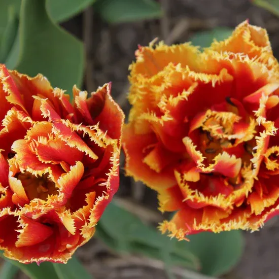 Тюльпан Golden Dust — один із найефектніших махрових сортів із бахромчастими пелюстками. Його квіти мають неповторне поєднання кольорів: насичено-червоні та помаранчеві пелюстки обрамлені золотистою бахромою, що створює враження сяйва на сонці.