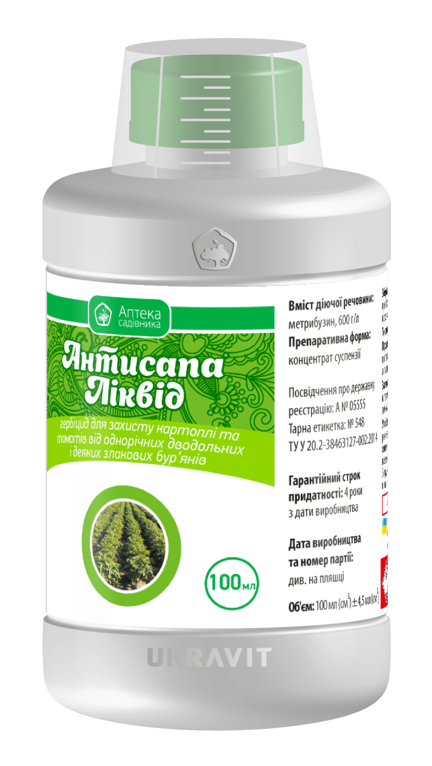 Препарат Антисапа Ліквід є гербіцидом системної дії, який застосовують при обробці посівів сільськогосподарських рослин для знищення однорічних дводольних, а також злакових бур'янів. Діюча речовина, метрибузин, проникаючи в рослини, активно гальмує ріст і поділ клітин, порушуючи в них білковий та ліпідний обмін, що призводить до відмирання бур'янів. Засіб має тривалий ефект, оскільки діє як через листя бур'янів, так і через грунт. Гербіцид Антисапа Ліквід ефективний у застосуванні при обробці посівів картоплі, томатів, сої, моркви від волошки синьої, щириці звичайної, лободи (види), ромашки (види), портулаку городнього, осоту городнього, галінсоги дрібноквіткової, амброзії полинолистої, кучерявцю Софії, талабану польового, зірочника середнього, гірчиці польової, курячих очок, грициків звичайних, дурману звичайного, рутки лікарської, жабрію звичайного, кропиви (види), льонку звичайного, калачиків (види), переліски однорічної, вероніки (види), нетреби (види), фіалки польової, лисохвісту мишохвостикового, вівсюгу звичайного, проса (види), пальчатки (види), мишію (види), тонконогу, свинорию пальчастого.